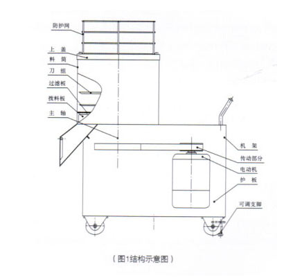 2.1主要結構 本機主要有機架、傳動(dòng)部分、刀組、過(guò)濾板、撥料板等結構組成。(參見(jiàn)圖1主要結構簡(jiǎn)圖)